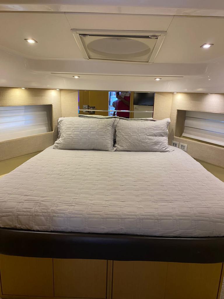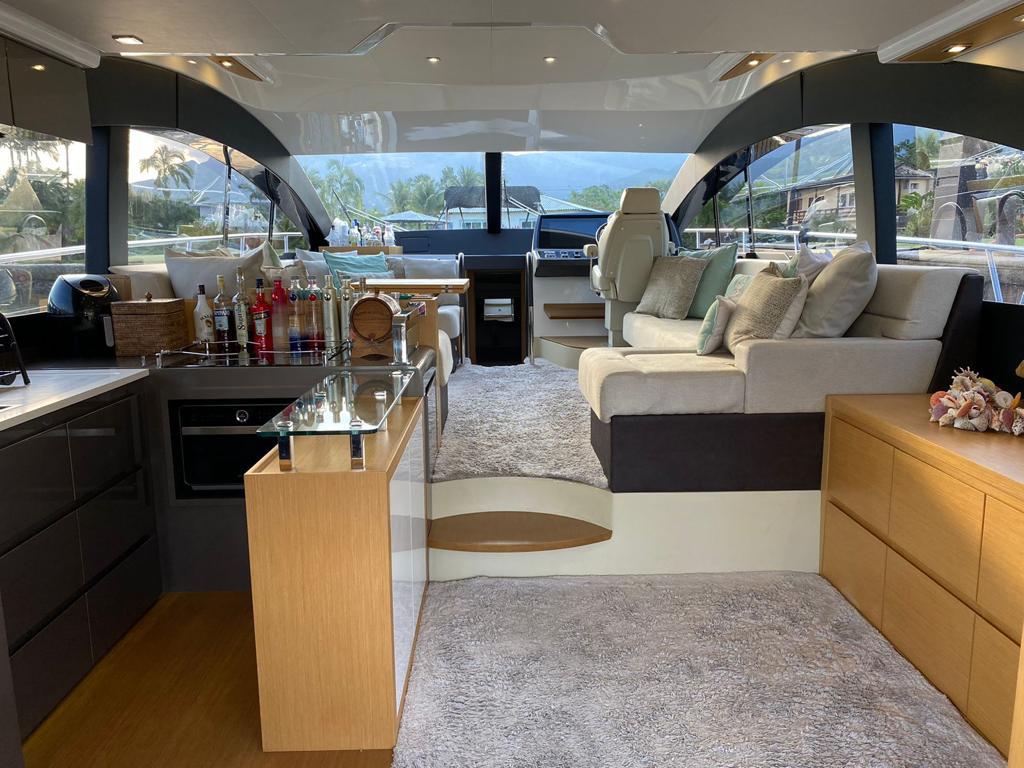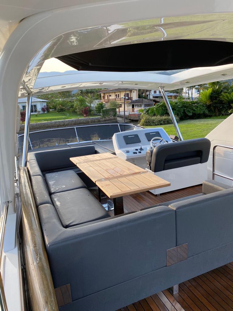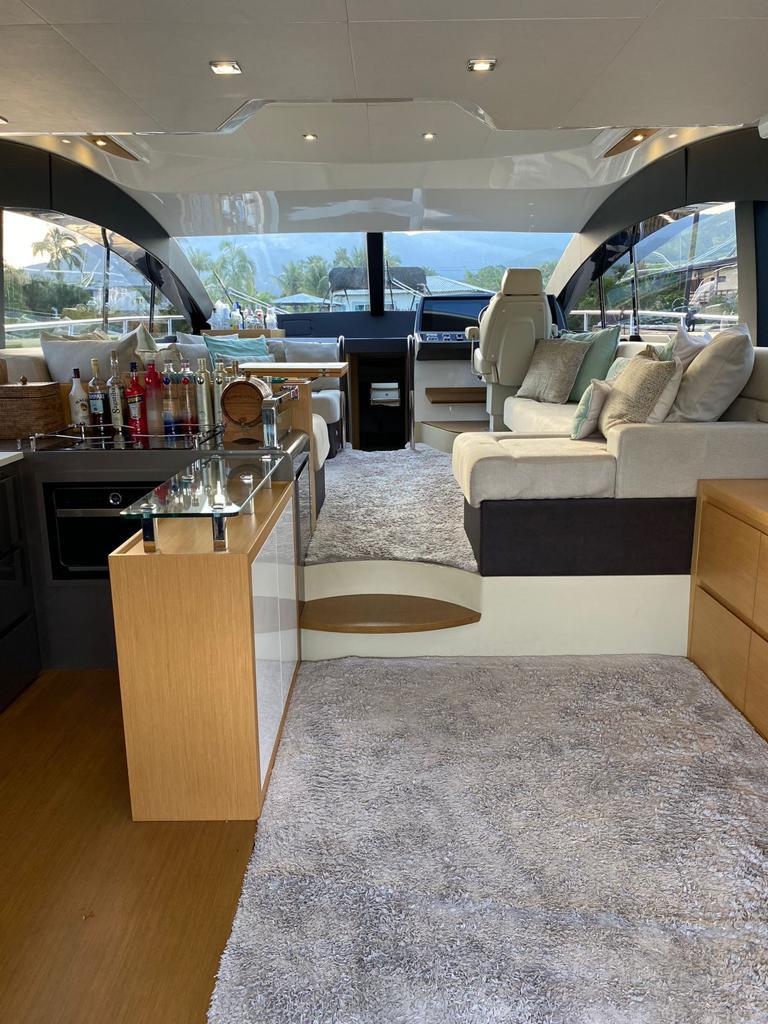A embarcação se destaca pelo design sofisticado, pelos acabamentos de alta qualidade e por uma série de acessórios que garantem conforto e praticidade, como espaço gourmet, bar no fly, gerador e sistema de som integrado.