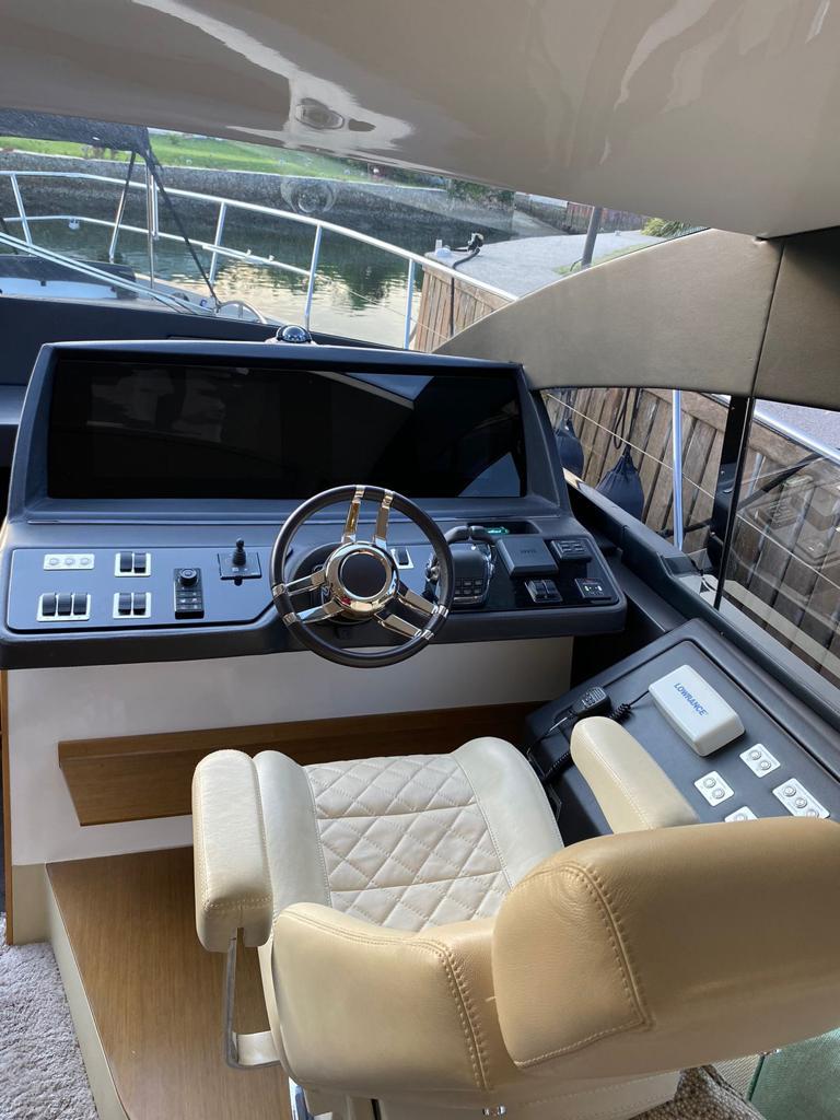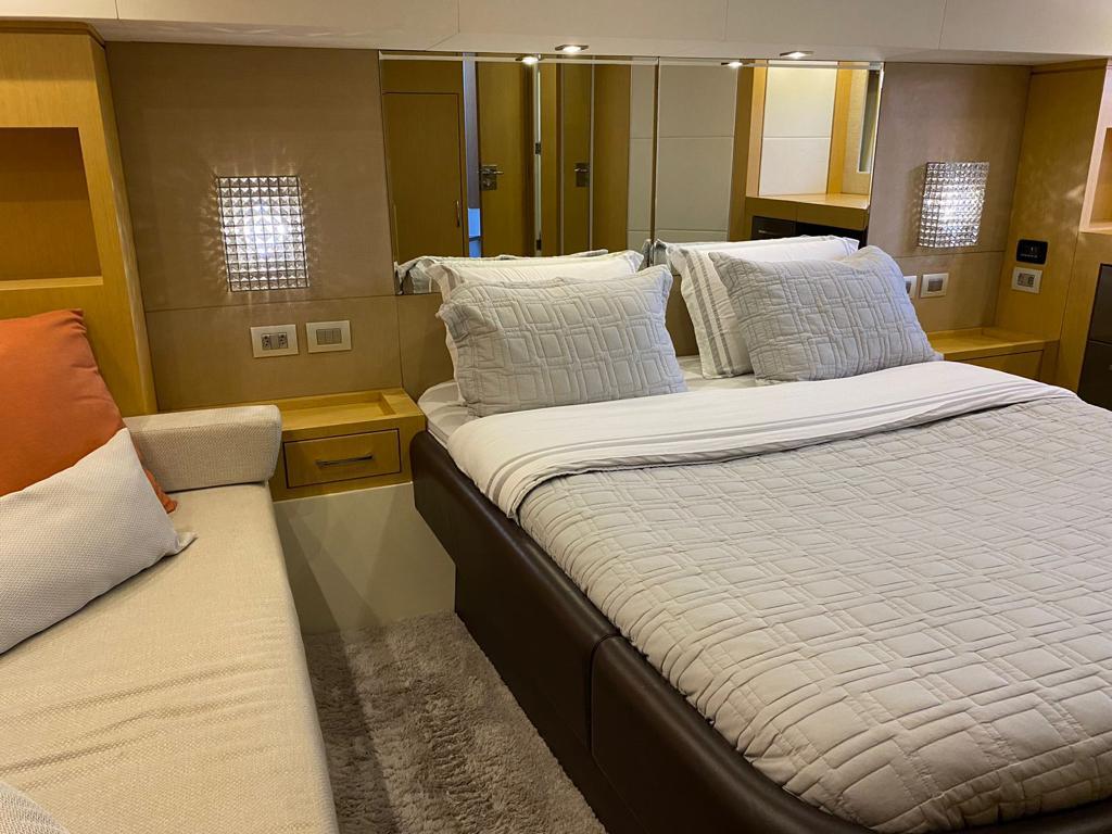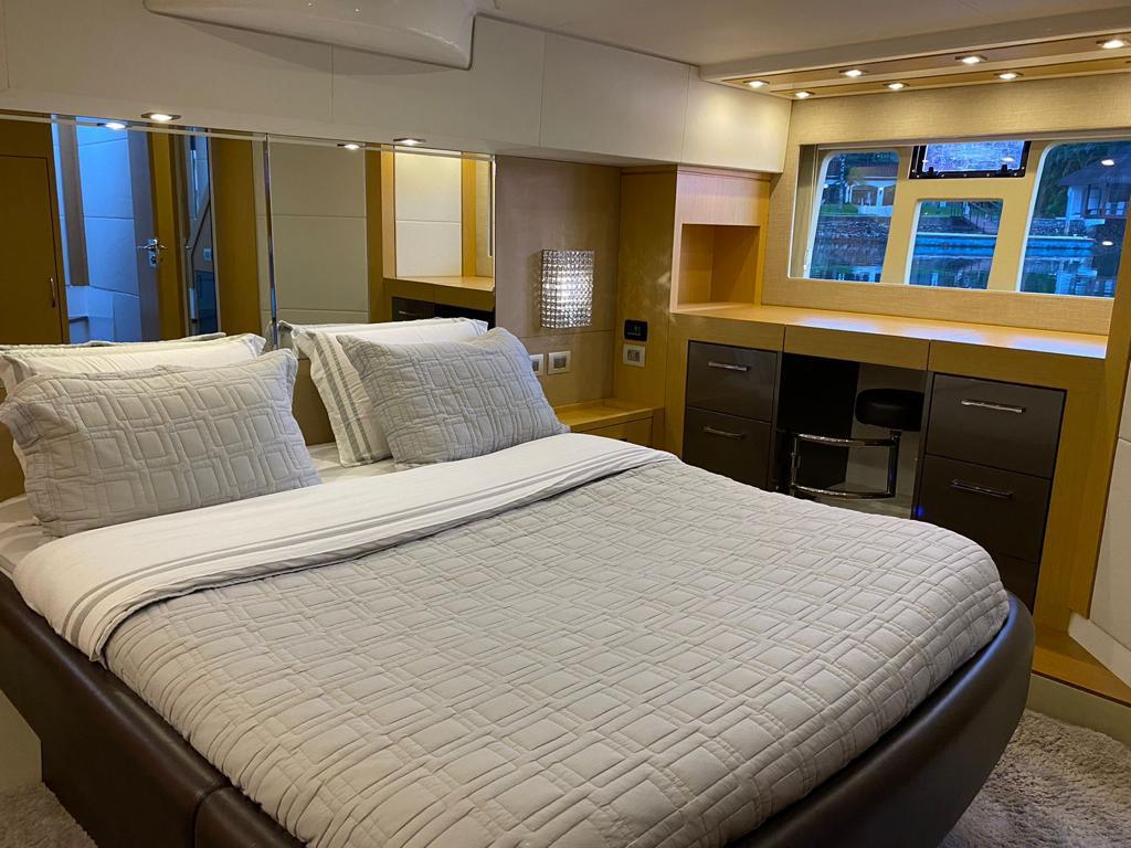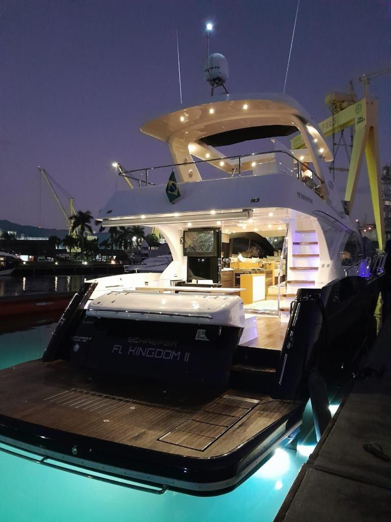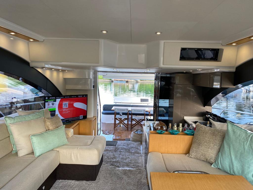 A embarcação se destaca pelo design sofisticado, pelos acabamentos de alta qualidade e por uma série de acessórios que garantem conforto e praticidade, como espaço gourmet, bar no fly, gerador e sistema de som integrado.